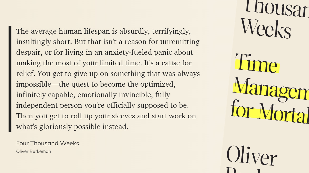 I just finished this wonderful book about our relationship with time. The book is focused on revealing the finite nature of our brief time on earth (i.e. four thousand weeks), and the power we can unlock by facing up to and internalizing its finitude. Money quote: